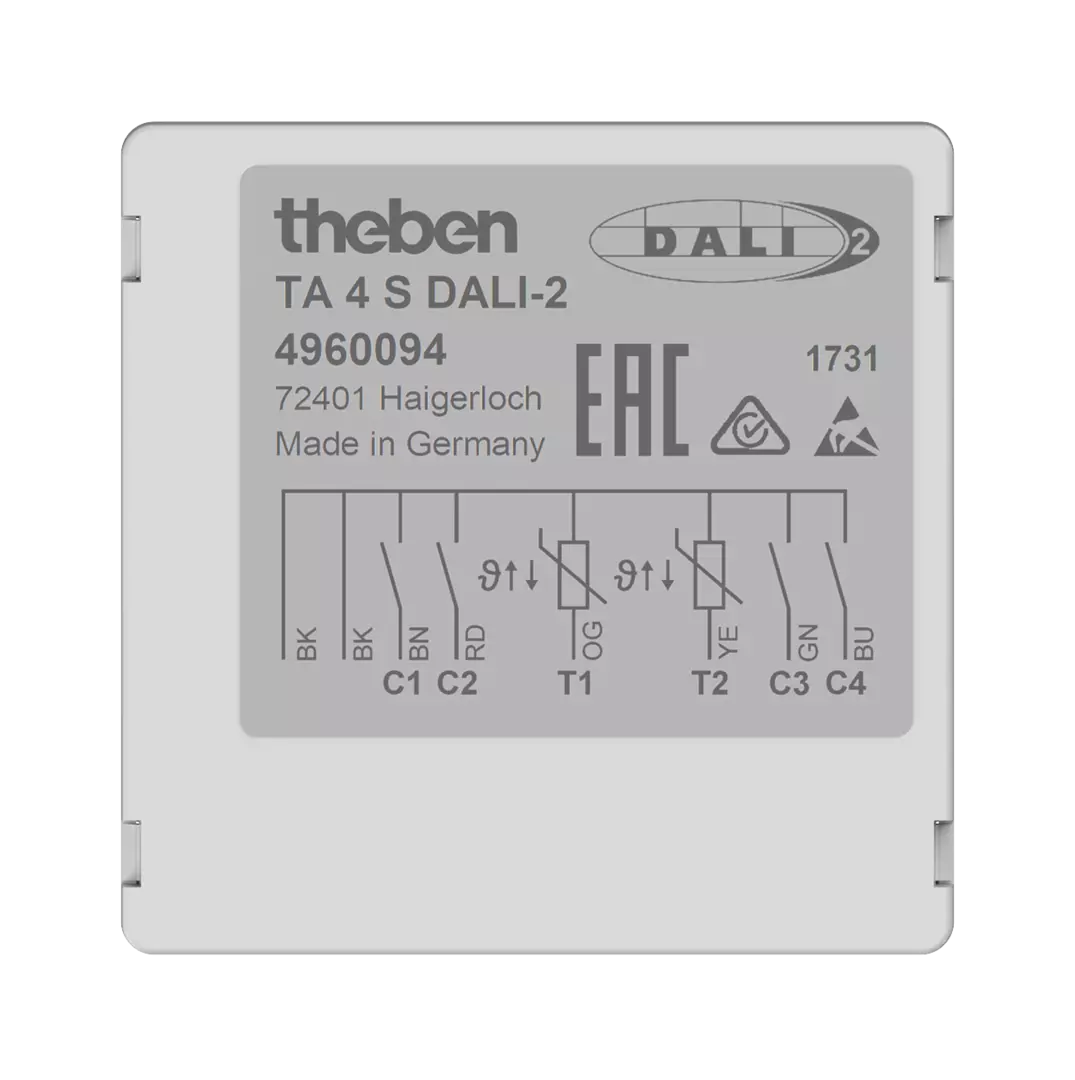 The Theben TA 4 S DALI-2 is a high-quality, compact 4-fold pushbutton interface for DALI-2 installations, designed for easy integration into standard flush-mounted boxes. This interface allows connection of up to four potential-free switches or pushbuttons, each configurable as normally open or normally closed contact. The contact type is easily adjustable via the internal memory bank.