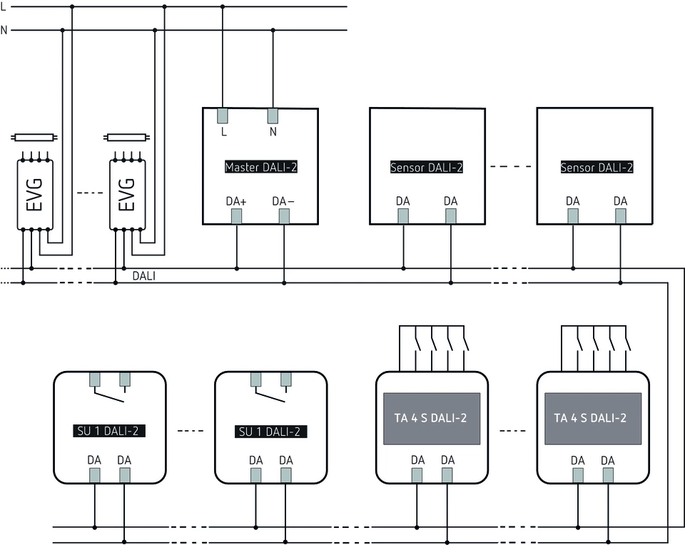 - Analizza le informazioni dalle interfacce a pulsante DALI e controlla attuatori DALI secondo lo standard DALI-2