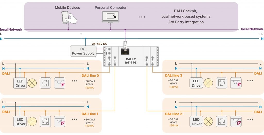 Beispielanwendung DALI-2 IOT 4 mit DALI Power Supply – 120mA/Linie für bis zu ~30 Betriebsgeräte/Linie (22176625-PS):